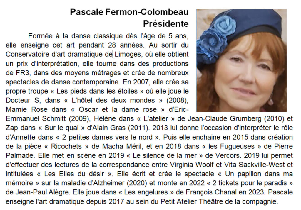 Fondée en 2007 par Pascale Fermon-Colombeau, avec la complicité d’Hubert Lartigue, la Compagnie théâtrale « Les pieds dans les étoiles » a, depuis, obtenu de beaux succès à travers de nombreuses pièces montées depuis sa création et jouées non seulement à Limoges mais aussi en Haute-Vienne et hors région.