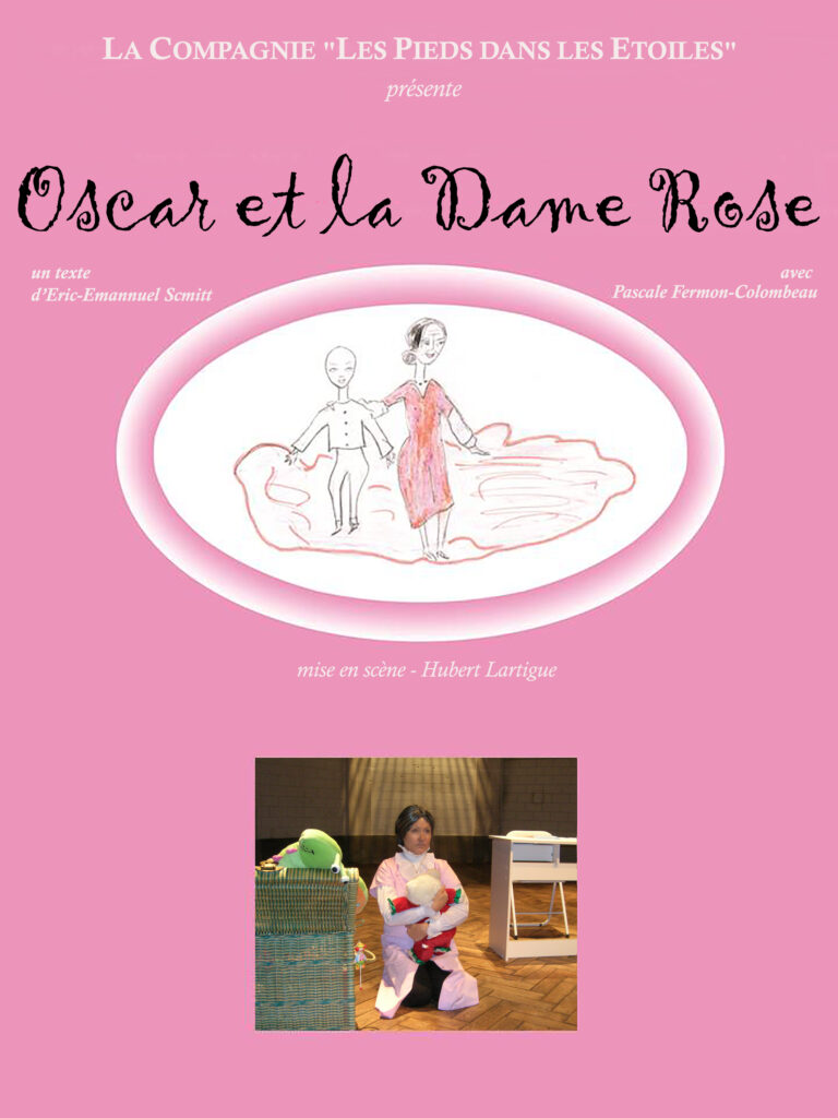 Oscar a dix ans et il vit à l’hôpital. Même si personne n’ose le lui dire, il sait qu’il va mourir. La dame rose, qui le visite et qui « croit au ciel », lui propose, pour qu’il se sente moins seul, d’écrire à Dieu. Les questions métaphysiques qui sont les thèmes récurrents des livres et des pièces de l’auteur, jalonnent celle-ci à travers les propos des personnages… Autour d’Oscar et de Mamie Rose, bien d’autres personnages prennent vie, à travers l’unique comédienne et tissent la trame de la vie d’Oscar, vécue en accéléré, grâce au jeu dont les règles sont celles établies par Mamie Rose.