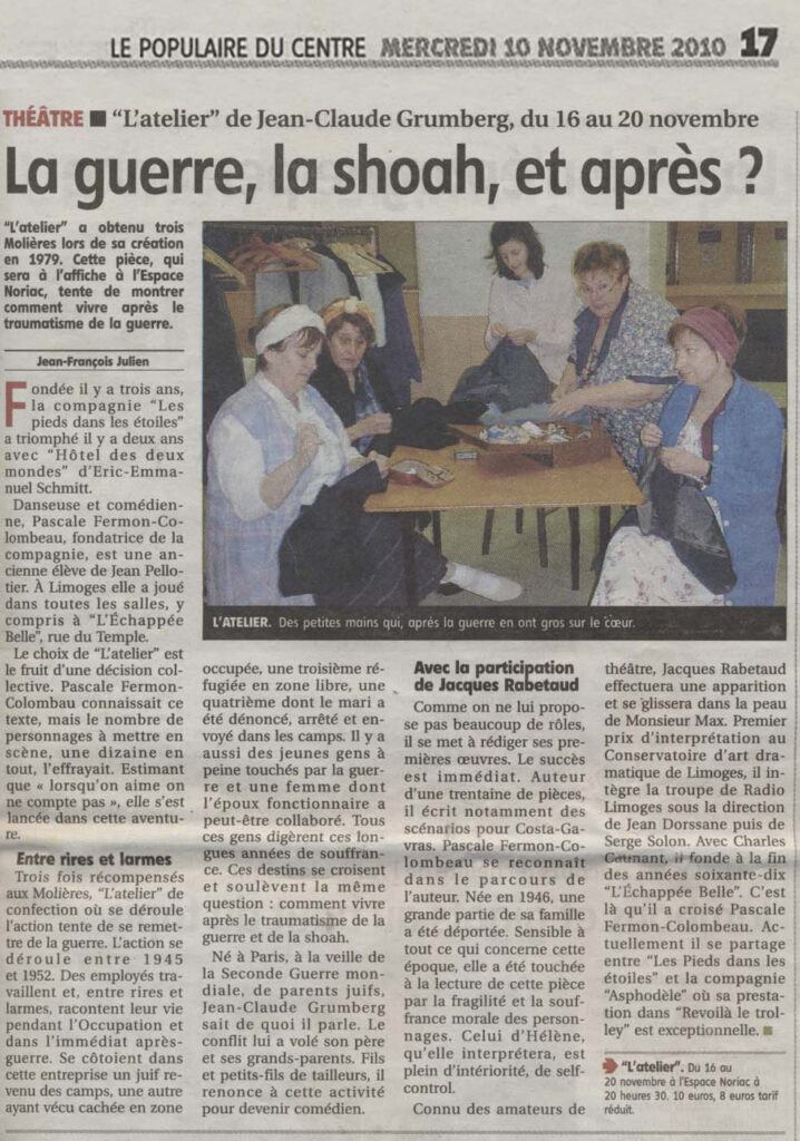 Avec Emilie Bernard, Bernadette Chatenet, François Dieuaide, Michèle Dupuy, Sylvie Fabre, Pascale Fermon-Colombeau, Jacques Rabetaud, Fabien Rouchon, Valérie Tessier, Jean-Michel Touraine.